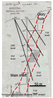 Figure 2 . Cross section through the Silver King mine workings showing proposed drill holes (in black) to test the pipelike mineralized body (in red)