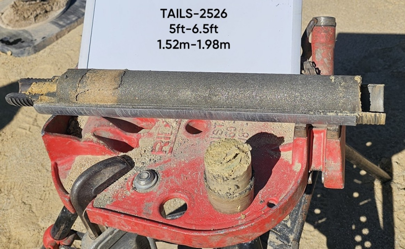 34 holes (Figures 1 to 3) were advanced vertically into the legacy tailings using a truck mounted auto hammer equipped hollow stem auger rig – the auger was not required because the coarse sand sized tail material is well compacted and the auto hammer advanced well and returned high quality samples. Each hole was advanced through the entirety of the tailings until native ground was encountered. Recovery was excellent at near 100% for all collected samples, representative images are shown in Figures 4 to 6. Samples were collected at 0.46 m (1.5 ft) and 0.61 m (2 ft) intervals from surface using 6.4-centimeter (2.5-inch) California split spoon tube sampler equipped with sand catcher. The full sample was placed into 11’x17′ Nano-Por Geological sample bags, sealed, and delivered to American Assay Lab (AAL) in Reno, Nevada for assay with representative material saved in chip trays for preservation. Field duplicates were obtained by splitting the sample into two equal portions and following the same procedures as full samples.