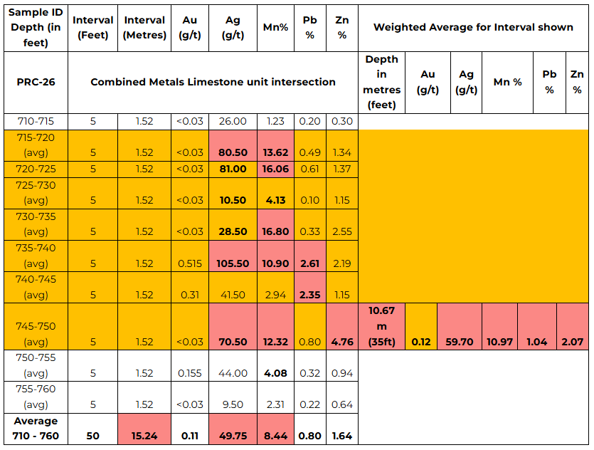 • including 10 feet (3.05 metres) at 120.00 g/t Ag, 3.62 g/t Au, 1.55% Mn, and 2.42% Pb.