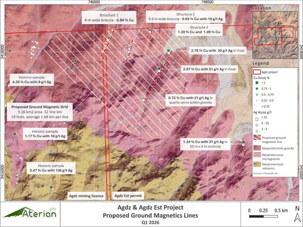 The data generated from this programme will feed into Aterian’s previously announced partnership with Lithosquare, the AI-based exploration platform. The data will be used to assist in evaluating Agdz alongside other assets for selection and accelerate decision-making for advanced exploration and drilling. This approach supports a disciplined, technology-enabled framework for prioritising projects with the greatest potential for scalable copper-silver development.