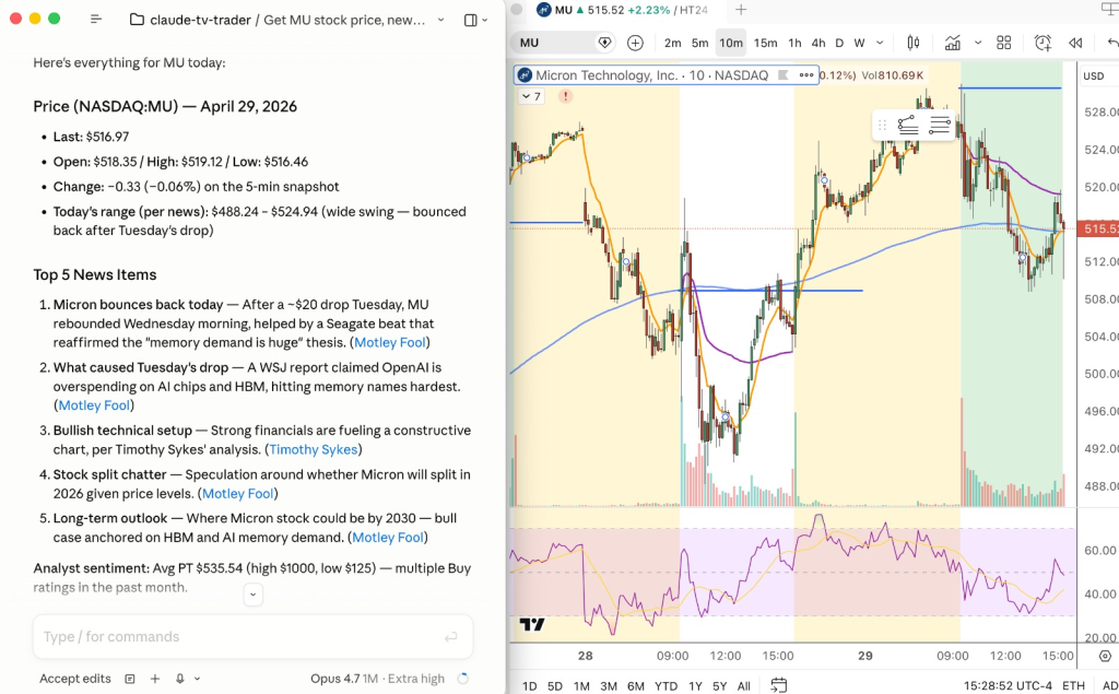 • No coding required for most of it. You don’t need to learn Pine Script just to ask Claude to scan your watchlist for gappers. You type the request in plain English.